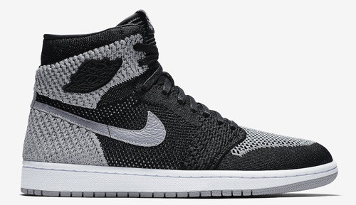 Looking just like the original release, the shoe features a full Flyknit upper in Black and Medium Grey with leather detailing on the Swoosh and Wings logos. A White midsole and Grey rubber outsoles completes the OG look.